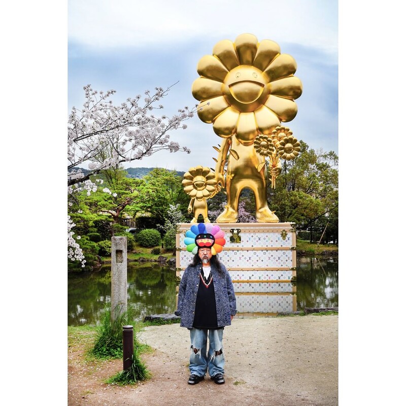 村上隆与路易威登的合作不止于包款配件,在2020年时,村上隆在全球新冠疫情期间打造了名为《Flower Parent and Child》的巨型金色雕像,而这座雕像在今年9月搭配着村上隆在2003年设计的缤纷Monogram行李箱一起在京都市京瓷美术馆的日本花园中再度亮相!