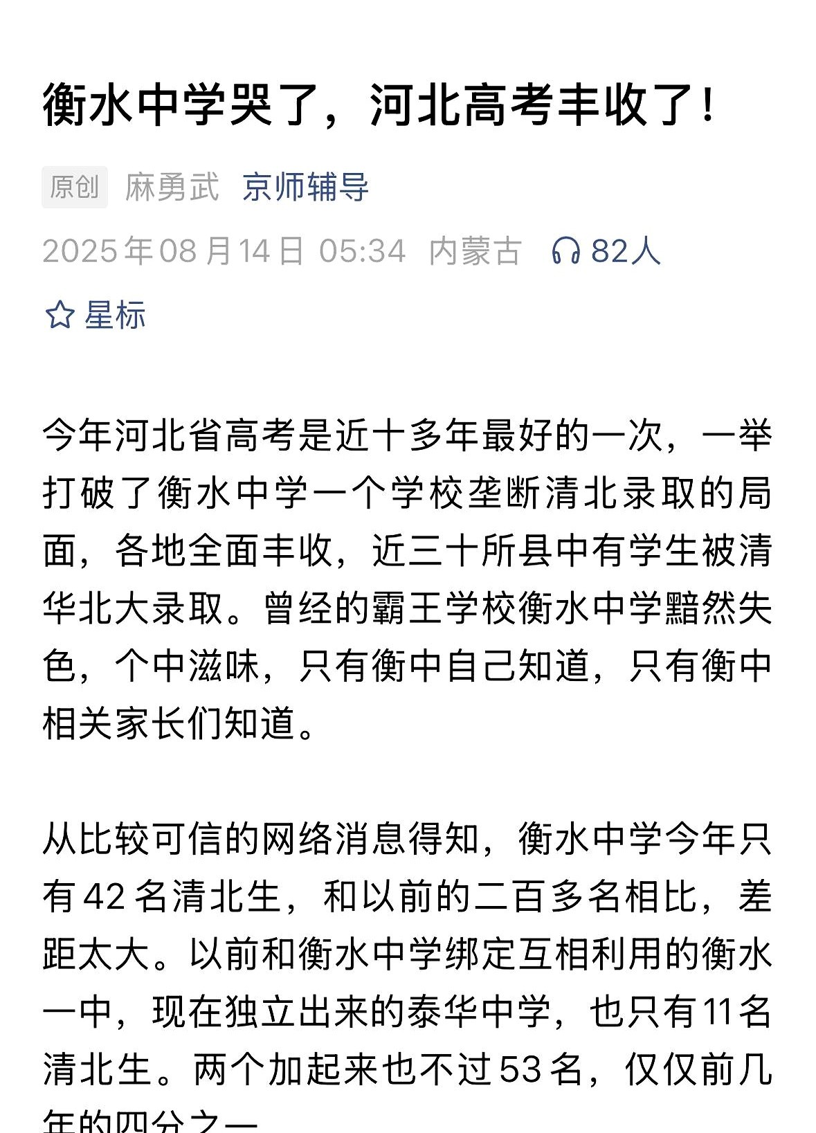 衡水中学清北人数下滑,不是因为老师突然不会教,而是尖子生被政策挡在门外。
