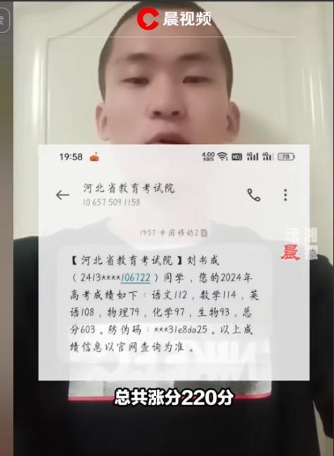 2024年高考分数一出来,河北衡水有个叫刘书成的男生,从383分一路狂飙到603分,这事儿立马在网上火了。一年时间,分数涨了220分,真是太厉害了!